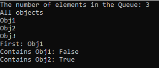 Console.WriteLine("Contains Obj1: " + queue.Contains("Obj1"));